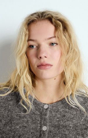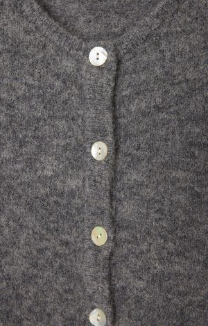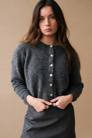 The Vito button-up cardigan sweater from American Vintage comes in a steel grey color. Crafted from 34% alpaca, 34% wool, 29% polyamide, and 3% elastane. Made in Italy and Bulgaria. Style code: VITO19EH24.