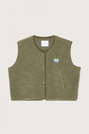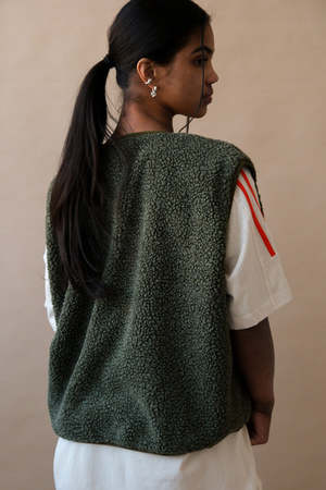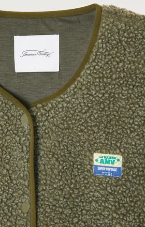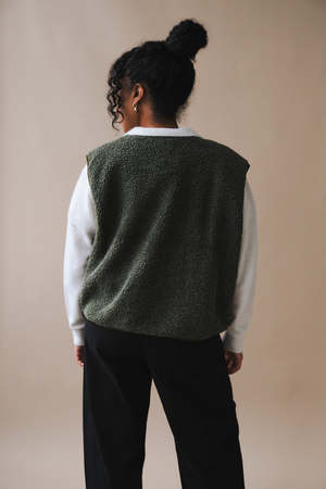American Vintage Hok shearling fleece vest in Varan olive green. 100% recycled polyester. Made in China. PIPE AND ROW