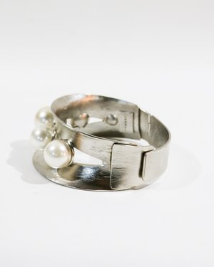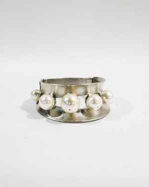 This silver metal cuff choker from Chanel features oversized faux pearl embellishments and flat locking closure. Material: Metal & Faux Pearl Rating: 8 / 10 - Minimal signs of wear. MEASUREMENTS Circumference: 14 in Width: 2.5 in ** No adjustments to prior markdowns. For product inquiries please contact shop@consignmentbrooklyn.com.