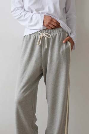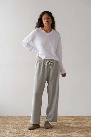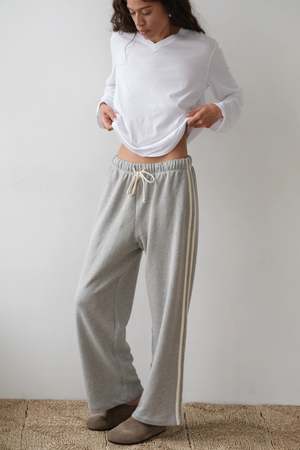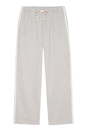 Sporty, clean, and just structured enough, the Eco Terry Stripe Crop Pant in heather grey feels effortless in the best way. Designed with a relaxed, slightly cropped leg and an easy drawstring waistband, it has that borrowed-from-athletics shape, elevated. The heather grey keeps it neutral and versatile, while the stripe detail adds a subtle edge. Made from soft eco terry, its comfortable but still holds its line the kind of pant you throw on and instantly feel styled and put together. - 100% organic cotton French terry - Straight leg crop silhouette with drawstring waistband - Contrast side stripes - Side pockets - Machine wash cold, line dry - Made in Los Angeles Maya is 59, 34 bust, 25 waist, 33.5 hips. She is wearing a size small.