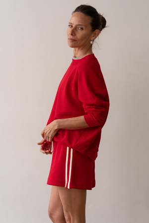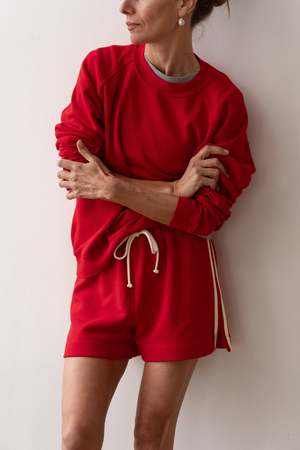 The Stripe Eco-Terry Short from Donni is crafted with 100% Organic Cotton, featuring a drawcord waist, side pockets, and double stripes on each leg. Made in Los Angeles. Simone is 58, 33 1/2 bust, 24 1/2 waist, 34 1/2 hips. She is wearing a size small. 100% Organic Cotton
