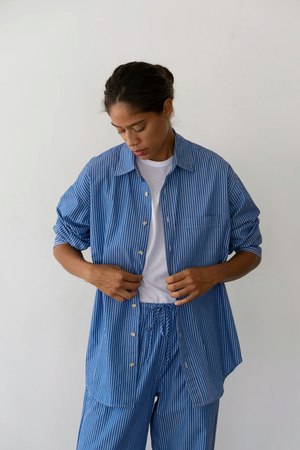 A timeless wardrobe staple designed for effortless styling. Crafted from crisp cotton poplin, it features a back yoke with double pleats, a front square pocket, tortoise buttons, and pleated cuffs. Inspired by vintage men's shirting, its intentionally relaxed fit offers a perfect balance of structure and ease. Made in Los Angeles.