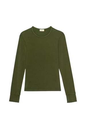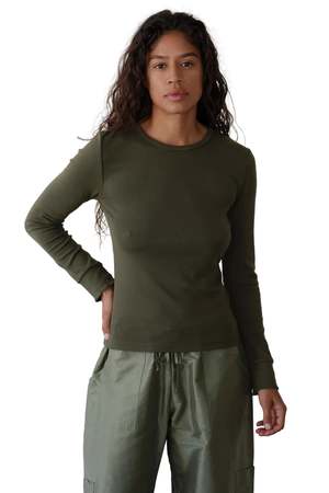 The Baby Rib Scallop Long Sleeve Top from Donni. is crafted from an exceptionally soft ribbed fabric. Designed with a classic crewneck, a slim fit, and finished with scalloped edges along the neckline and cuffs. Made in Los Angeles. 47% Modal, 47% Cotton, 6% Spandex.