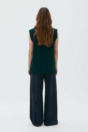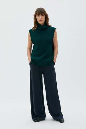 The Vani ribbed high-neck vest is made from an extra-soft lambswool and cashmere blend from Italy. It features a full cardigan structure that continues up onto the collar. The back is cut slightly larger than the front to give it shape, and it has side vents for added ease of movement. Layer over a turtleneck top and relaxed denim trousers for an elevated everyday look. Material: 90% Lambswool, 10% Cashmere Made in Lithuania. Fit: - The model is 175 cm and wearing a size S - Relaxed fit - Generous sleeve holes - Straight body, somewhat more generous in the back - We recommend choosing your regular size for a relaxed, slightly oversized silhouette