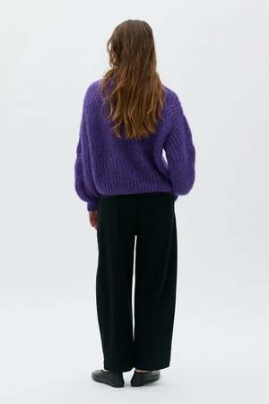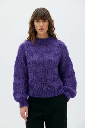 The Dove Sweater from maska.se is a lace knit style where oversized allure meets the grace of lace and a luxurious blend of silk and mohair. Light, soft, and lustrous, it offers an exquisite balance of warmth, softness, and heightened style. This relaxed-fit sweater features dropped armholes, a generous silhouette, and ribbed cuffs and hem for a refined finish. Its designed for smart-casual, feminine looks and pairs effortlessly with tailored pieces like the Eos trousers. Color: Lupin Lilac (purple hue) Materials - 50% kid mohair, 50% silk - RMS The Responsible Mohair Standard Fit & Sizing - Generous fit - The model is 175 cm and wearing a size S - Choose your usual size, or smaller if you are between sizes Made in Lithuania.