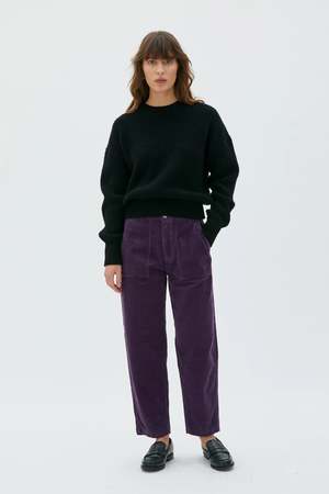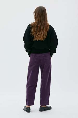 Barrel-leg pants with two large applied front pockets in a workwear style and classic back pockets. Tone-on-tone topstitching with a back leg detail seam adds volume. Normal waist, generous fit, and tapered bottom leg. Made in organic, wide-wale and extra-durable corduroy from Germany. Finished with a metal logo2 button. This style is garment dyed, so each piece will have its own unique characteristics. Materials - 100% organic cotton - GOTS (Global Organic Textile Standard) Made in Portugal. Fit - Regular, generous fit - The model is 175 cm and wearing a size M - We suggest choosing your usual size