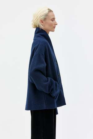 Hale is a cosy, oversized boiled wool jacket featuring dropped armholes, a statement shawl collar, and three matching bio-resin buttons for the front closure. The jacket also includes front welt pockets and clean inside finishes. Made from 100% high-quality boiled Italian wool, this jacket pairs perfectly with a chunky knit sweater for a layered, cosy autumn look. Product details - 100% Wool - Made in Lithuania Size & fit - The model is 175 cm and wearing a size S - Regular fit - We suggest to choose your usual size.