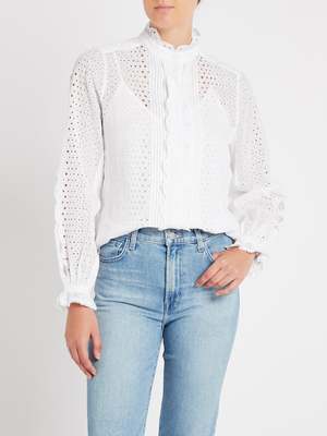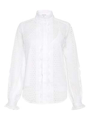 The Classic White Button Shirt gets an update with the Scallop Button Down Shirt in Blanc by Frame Denim. Constructed from delicate eyelet fabric this long sleeved top features a scalloped trim with sleek cut out placement along the sleeve and is finished with a curved hemline. Style yours your favourite cut-off short denim or vintage-inspired jeans for the ultimate weekend relaxed look. ---- FABRIC OR COMPOSITION The Frame Denim Scallop Button Down Shirt in Blanc is made from 100% Cotton SIZE AND FIT The Frame Denim Scallop Button Down Shirt in Blanc fits true to size Neck Drop: 5cm / 1.9inch Sleeve Length: 63cm / 24.8inch Back Length: 64.5cm / 25.3inch Measurements taken from a Size S Model is wearing a Size S, Sarah is 178cm / 59 Bust 83cm / 32 1/4 in /// Waist 66cm / 26 in /// Hips 89.5cm / 25 in