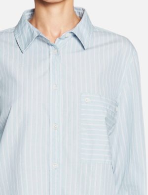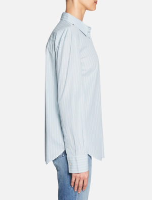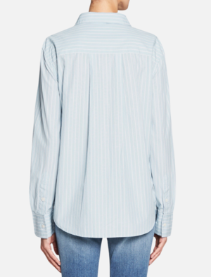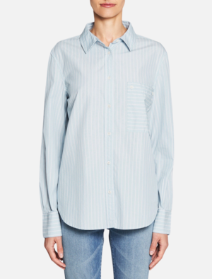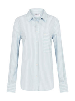 Get on the stripe train with the Frame Denim Boyfriend Poplin Tee. This crisp and lightweight classic cotton button down shirt features a fold over collar, patch pocket and curved hem. Team with your favourite denim jeans for an easy take on the stripe trend. ---- FABRIC OR COMPOSITION The Frame Denim Boyfriend Poplin Shirt in Sky / Blanc is made from 100% Cotton ---- SIZE AND FIT The Frame Denim Boyfriend Poplin Shirt in Sky / Blanc is true to size Measurements taken from Size S Back Length: 27.25in / 69cm Model wears a Size S Paulina is 178cm / 510 ---- BRAND Founded by four friends on opposite sides of the globe, Frame Denim takes inspiration from London and LA and has become a global cult denim brand. Wanting to create the perfect pair of jeans, the founders of Frame took the brand even further after the success of its debut jean, Le Skinny, and launched a full ready-to-wear brand of simple and chic fashion essentials. Renowned for their on-trend cuts, styles and washes, Frame jeans are sexy, flattering and a must-have wardrobe staple. Shop Frame Denim online at Order of Style and check out our sale page for our Frame Denim sale.