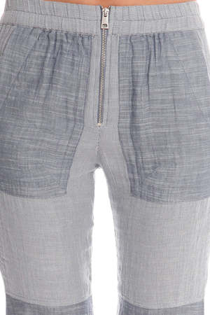 Denim style pant with a front zip detail and elastic waistband. Featuring front patches and two side pockets. - Color: Blue - 100% Cotton - Made in India - Machine Wash Cold * Model is 5'9" wearing size 2 Productcode GATS4-3 Designer GAT RIMON