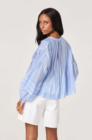 ASTR the Label Ericka Top in a blue stripe. Voluminous balloon sleeves with wraparound pleats bring dramatic sophistication to this striped blouse. The pleated shoulders and neckline create dimensional texture, while the button cuffs allow for versatile styling. Lightweight woven striped blouse V-split neckline Full button-front closure at center front Pleating at shoulders and back neckline Balloon sleeves with wraparound pleats Button-closure cuffs Semi-cropped, loose fit 82% Lyocell, 18% Nylon Dry clean only
