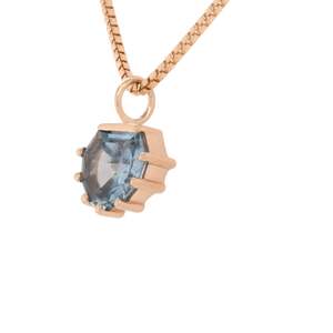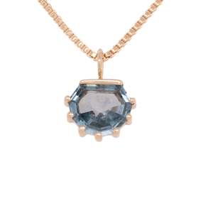 A uniquely shaped summer sky-blue Montana sapphire. This stone is held snuggly with a bar and a prong at the tip of each point. This stunning pendant swings freely on a 1 mm pure gold 18 inch chain.