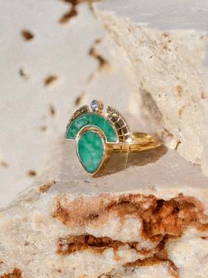 A teardrop of inlaid Broken Arrow Turquoise stone surrounded by 14k pure gold on a triangular hand carved signature Young in the Mountains Helena band. 14k recycled yellow gold, inlaid stone ethically mined in Nevada, USA. Pairs perfectly with the Rising Sol Crown Arch Ring Crown. Details: 14k yellow gold Teardrop shaped Broken Arrow Turquoise stone Handmade in the Rocky Mountains.