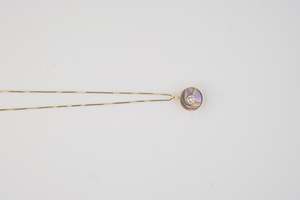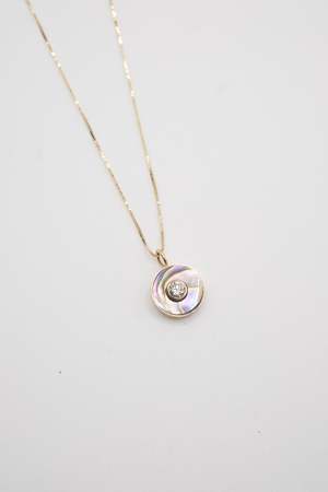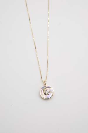 Abalone and white diamond set in 14k gold on a gold chain.