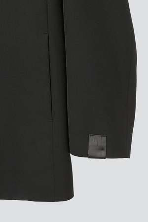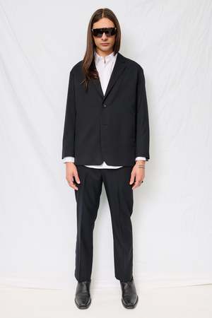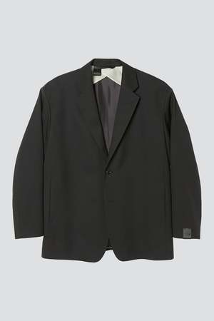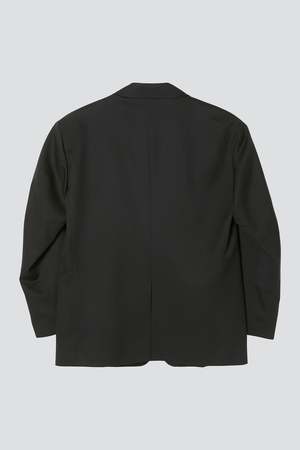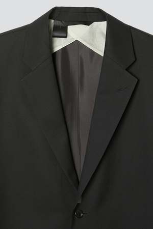 Minimally tailored suit jacket with 3 button front closure and two side slit pockets. Original buffalo buttons with the name of each part engraved on the front and inside pocket. The brand name in black, an icon of N.HOOLYWOOD COMPILE, is placed on the left sleeve. - Exterior: 100% Tropical wool - Front body lining: 100% Polyester - Back body lining: 100% Acetate - Back sleeve lining: 55% Cupra / 45% Polyester Made in Japan.