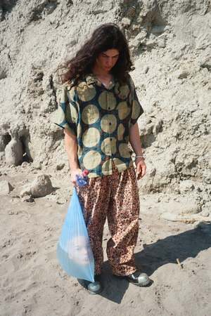 With the silhouette of a big retro bowling shirt, the Greetings Short Sleeve is a wide, over sized, slightly cropped button up in pale indigo with floral paisley patterning, and an overlay of large beige circles blending into the blue behind them. This garment was block printed onto 100% natural linen, and resist dyed using kaduka and iron by Sufiyan Khatri. Features namesake 'Story MFG' precious embroidery along the upper left chest pocket. Story mfg works with a large group of natural dyers, weavers, embroiderers and tailors in their atelier in the Indian forest on each of their seasonal collectsions. Seasonally they work with a new artist to feature their designs in collaboration with their aesthetic principles. Measurements: Size Medium: Bust 51, Waist 50.5, Shoulder 21.5, Sleeve 10, Length 281/4 Size Large: Bust 53, Waist 52.5, Shoulder 22.5, Sleeve 10, Length 28.5 Cyrus is 5'11 with a 34" waist, and wears size medium with the Lush Pants in Ecru Herbal Corduroy. Material: 100% naturally dyed linen. Made in India.