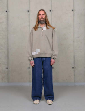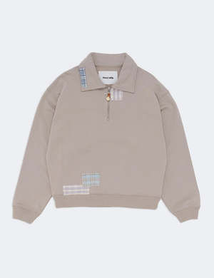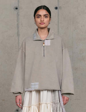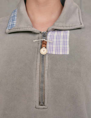A heavyweight, 3/4 zip sweatshirt made from 100% organic cotton. The pullover features a boxy, slightly cropped fit inspired by vintage sweats, finished with a corozo nut bead pull and handwoven patches throughout. Color/Design: Grey Picnic Model wears size M. 100% Organic Cotton.