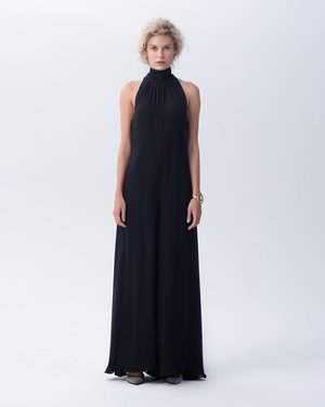 Silk jumpsuit moves beautifully to feature dramatic palazzo leg. Invisible zipper closure at back featuring keyhole opening and covered buttons at the neck. Comes with matching removable belt. - 100% silk with 100% silk chiffon lining - Lined in 100% silk, Made in New York - Model is 5'10" and wearing a size S - Product Care: Dry Clean Only