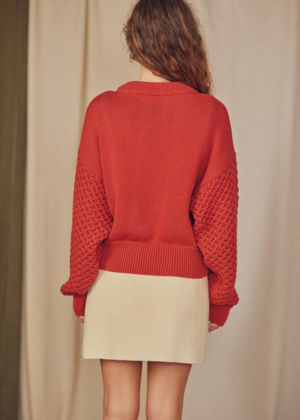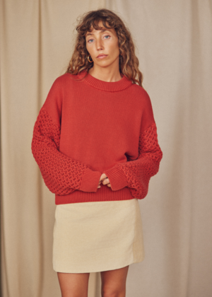 Red knit sweater with fantasy sleeves. Made from 100% organic cotton. Model is 5'7" and wears a size S. Designed in London, made in Portugal.