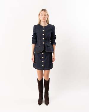 Update your wardrobe with the Denim Claudia Skirt, featuring gold buttons down the front and contrast stitch detailing. Its timeless design pairs seamlessly with graphic tees or blouses to create an easy casual look. Concealed side zipper closures Front button details Mini length Fabric: Denim Cotton 77% Polyester 21% Elastane 2%. Dry clean only.