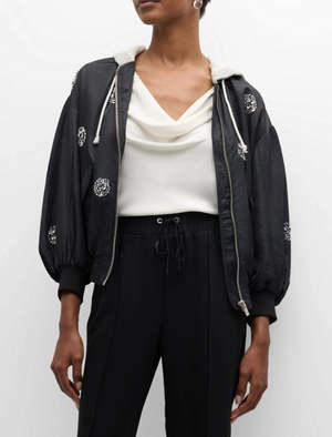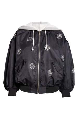 Fabric type: 100% Nylon Care instructions: Dry clean Origin: Imported About this item Lining: 100% polyester Fabric: Mid-weight, non-stretch technical weave Crystal embellished design throughout Flap front pockets Long sleeves with dropped shoulders