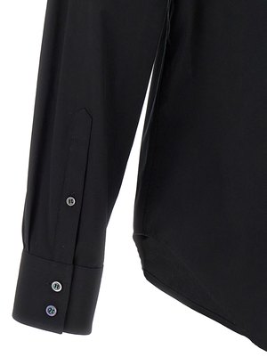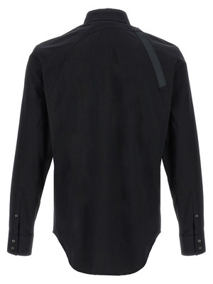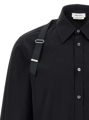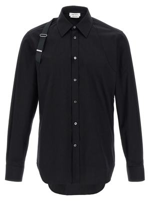 Cotton poplin shirt with 'Harness' detail with metal buckle, front button closure, and long cuffed sleeves. Composition: 97% cotton, 3% elastane.