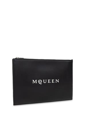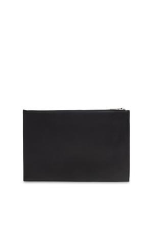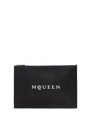 Discover the epitome of contemporary elegance with this black leather envelope clutch by Alexander McQueen. Crafted from smooth, premium calfskin with a refined matte finish, its subtly structured, rectangular silhouette is accentuated by crisp, defined edges embodying effortless sophistication. The striking front features the iconic designer's name in bold white letters, with the stylized C as a distinctive homage to the brand's unmistakable identity. The minimalist, monochromatic design deliberately eschews embellishments, focusing on timeless appeal. A robust silver-tone zipper secures your essentials, marrying bold aesthetics with uncompromising function. Composition: 100% Leather.