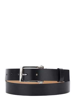 Black adjustable buckle belt with logo2 detail on the buckle. Features silver tone metalware and smooth grain leather. Height: 3 cm. Composition: 100% Calf.