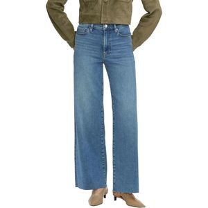 Le Slim Palazzo Jeans by Frame feature a high rise fit with a zip fly and button closure. These jeans have a wide-leg flare with a raw hem and a classic five-pocket style. Measurements: 11" front rise, 31" inseam, 22.5" leg opening. Fabric: 79% Cotton / 15% Lyocell / 4% Elasterell-P / 2% Elastane. Care: Machine wash. Closure type: Zipper. Origin: Imported.