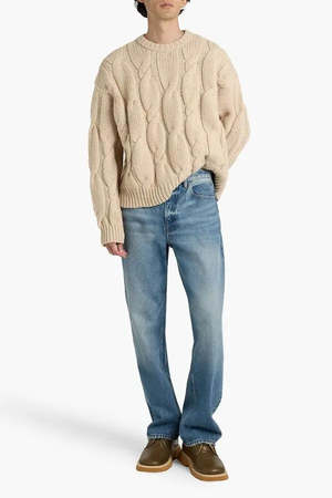 This FRAME sweater is crafted from cable-knit merino wool. It features ribbed trims and a chunky knit construction. The sweater simply slips on.