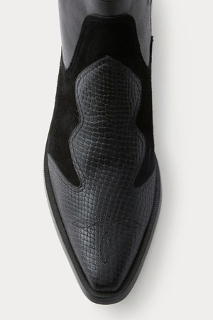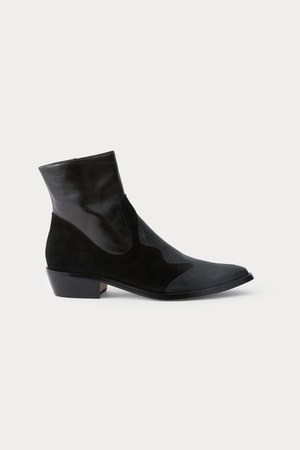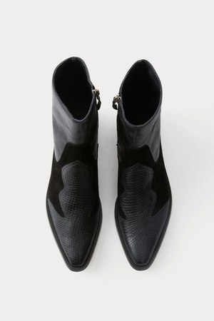 Cowboy-inspired ankle boot with a pointed toe silhouette, crafted from snake-print leather with smooth leather upper panels and suede side detailing. Features a low, squared heel for everyday wear, finished with a decorative overlay at the vamp and topstitching. Side zip closure 35mm heel height 252W-108-L5007 100% Cow Leather Upper, 100% Kidskin Lining, 100% Cow Leather Sole Made in Peru.
