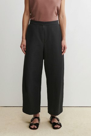 Cropped, pleat-front pants with an exposed tonal zipper in Rachel Comey's signature Italian foam jacquard. The soft cocoon shape creates a feminine, hourglass silhouette. - Exposed zipper - Welt pockets at hip Style code: 161W-506-T1009 86% Cotton, 14% Polyamide Made in USA.