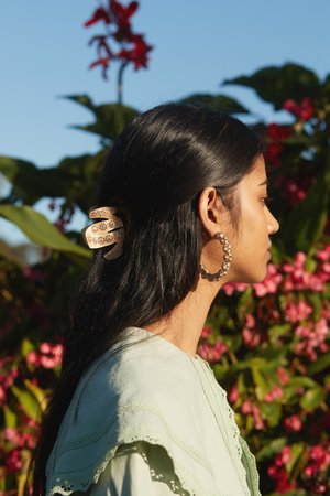 In a creamy, champagne the Lotus is a delight. This two thousands-Esque oversized claw style clip with crystal detailing pairs with neutrals and statement pieces alike. Hand-poured Acrylic Resin with Crystal Detailing. Length: 70mm Width: 55mm Also available in Green.