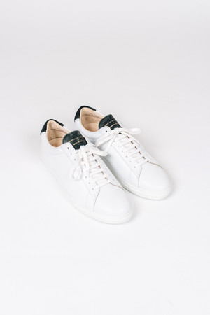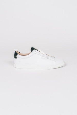 Description Made from Aix-en-Provence in the South of France, Zespa's round-toe sneakers are known for their clean lines and modern aesthetic. Constructed with 100% premium white smooth leather with contrasting forest green suede heel and tongue and finished with subtle gold foil branding. Other details include fully leather lined and textured outsoles. Made in France. 100% leather and fully leather lined. Size & Fit Sneakers come in euro sizing so we've converted them to US sizing. Care Instructions Keep leather surface clean and dry using a a dry, soft cloth