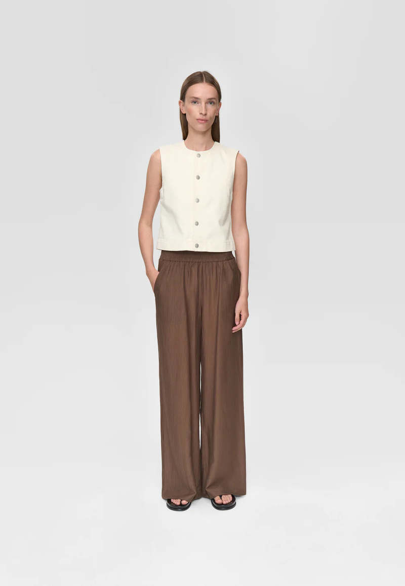Elastic-waist semi-sheer lyocell trousers for a fresh, relaxed look, featuring side pockets and a loose fit.