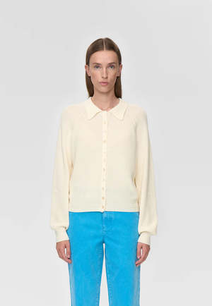 Classic-fit cardigan in soft cotton and cashmere. It features a delicate button placket adorned with small pearlescent buttons, a collar, and raglan sleeves.