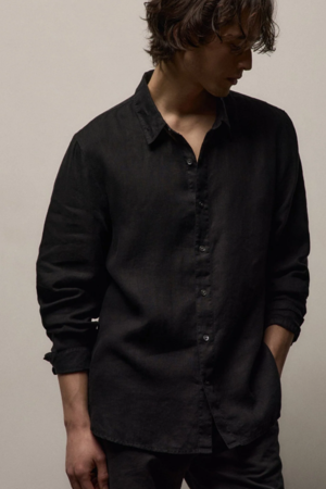 Classic Italian lightweight linen, breathable and soft. Button front closure with front chest pocket. Full-length sleeves with placket at cuffs. Back yoke and shirttail hem.