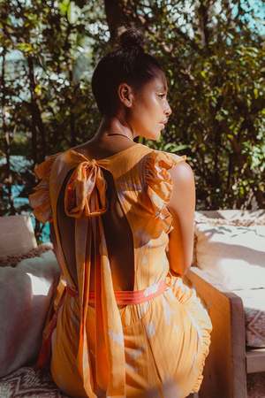 CAROLINA K Sleeveless style maxi dress featuring allover flowers print, flutter sleeves, open-back with self-tie bow, fixed waist, removable belt, and tiered silhouette. Desert Animals print pattern, Boat neckline, Flutter sleeves, Open back with self tie bow, Fixed waist with removable contrasting belt, Maxi length, Tiered skirt, Lined Composition: 100% Cotton Color: Desert Animals Gold Fit: True to Size