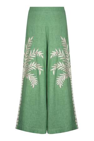 The Palazzo Pant by Carolina K features a banded, fixed high waist, side slant pockets, extra wide leg, and artisanal embroidery on the sides in metallic threads. It has a straight hem and is unlined. Composition: 100% Linen Color: Mint Fit: True to Size Designer ID: 325D04