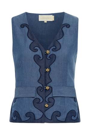 Rebekka Vest in Tencel denim. Sleeveless V-neck vest with side front pockets, front button closure, and lined interior. Composition: 100% Tencel Denim Color: Tencel Denim Fit: True to Size Final Sale Designer ID: 225SA07