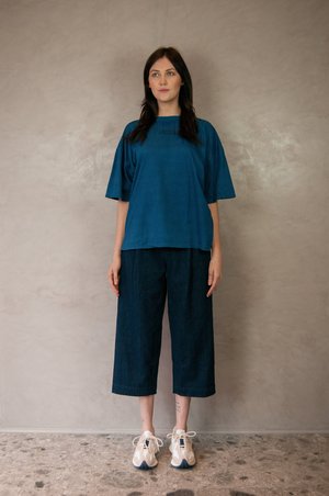 A pair of unisex trouser made in 10oz kala cotton khadi denim, yarn dyed in natural indigo *khadi is a term for homespun and hand-woven cloth from India *kala cotton is an organic khadi cotton Colour: Indigo Material: Kala Cotton Khadi Denim Shani Himanshu and Mia Morikawa provide the creative vision behind the brand, which is focused on ethical products and sustainability. Combining natural dyes with hand-spun Kadhi denim and Kala cotton, the brand preserves old heritage crafts and gives shape to a contemporary line of garments.