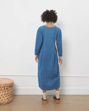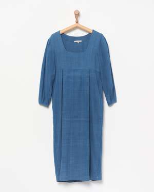 A beautiful, all-season woven dress, made from merged resist dyed organic cotton, in shades ranging from ecru to soft smoky blue. Features a roomy yet shaped silhouette, a square neckline with an empire waist, balloon sleeves, and special pleating details throughout. The handspun, handwoven organic cotton is indigo dyed using 100% fructose-based fermentation. Hand washable. Made ethically and sustainably, with zero waste, by skilled artisans in India.