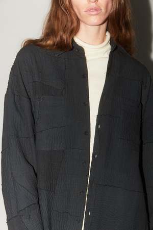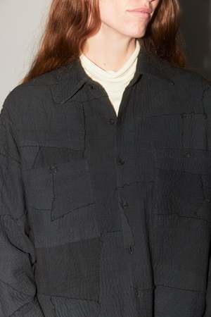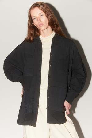 This statement unisex oversized shirt jacket features patch pockets, a center placket button front closure, and a high-low hem. Crafted with reclaimed fabrics and Kantha embroidery, overdyed in a shade of charcoal black. The black color is achieved using ferrous and tamarind seed solution with natural indigo. Composition: 50% Cotton, 50% Silk. Made in India. Measurements: Size 1: Chest 24" Size 2: Chest 25" Note: This is a UNISEX item with a generous fit; if between sizes or petite, size down.