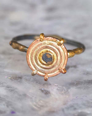 Many traditions around the world incorporate a version of the evil eye in their daily lives, whether as jewelry or adornment within the home. At Variance, we tend to stay away from representational art but we love the symbolism of it so we were inspired. The pupil in evil eye is made with 24k gold. The rest of the eye is made of mixed gold The claws are made of 14k white and rose gold and 18k yellow gold. The band is made of oxidized sterling silver with 14k-24k yellow, rose and white gold embedded into it. Crafted in Santa Cruz, California. Please note: Each piece is hand crafted, no two pieces are the same.