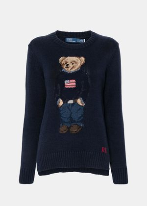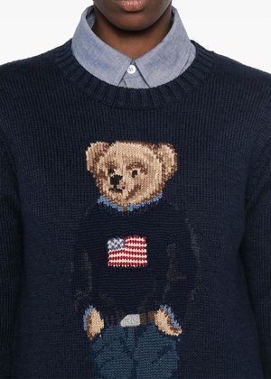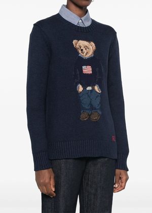 Long sleeve pullover sweater in navy blue with a signature Polo Bear motif. Features a cotton-linen blend knitted construction, intarsia-knit logo2, ribbed trim, crew neck, short side slits, and a straight hem. 67% Cotton, 33% Linen/Flax.