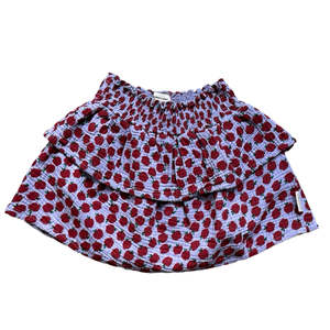 DETAILS - Lilac with red apples print - Short length with layered frills - Elasticized waist - Gauze construction - 100% Organic Cotton STYLE NOTES - Fits true to size - Designed in a soft organic cotton gauze with an allover apples print. Type: Skirt