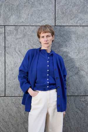 Not just your grandpa's cardi... but almost. Features a boxy, oversized fit and hidden button placket concealing corozo plant-based JS buttons. Knit with a jersey stitch and ribbed trims. Materials: 43% RWS Merino Wool, 43% RAS Baby Alpaca, 14% Polyamide. Fit: For the intended oversized fit buy true to size. See last photo for brand product measurements.