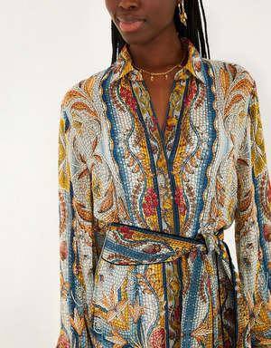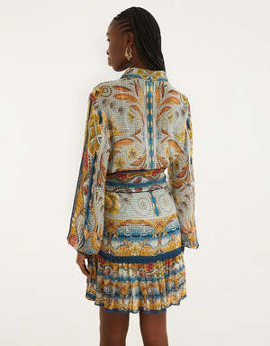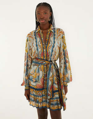Embrace playful elegance with the Mosaic Garden Mini Dress, where cool hues blend in a stained glass inspired patchwork of florals and stripes. Crafted from eco-friendly Lenzing Ecovero viscose, its relaxed silhouette features a crisp collar neckline and softly billowed sleeves that gather at detailed cuffs. The waist tie gracefully defines curves, while the captivating mix of patterns adds a charming, artistic spirit to every step you take. Closure: Centre front buttons Button type: Plastic buttons Sleeve type: Long sleeve Fabric: Shell: 100% Viscose Lining: 100% Viscose Care: Machine wash gentle, do not bleach, dry flat, iron at medium heat, do not dry clean. Made in China. Measurements and Fit: Fits true to size. We recommend taking your regular size.