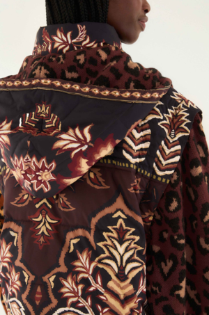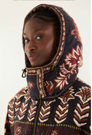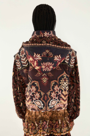 The Brown Winter Ainika Puffer Jacket invites cozy comfort with its rich brown hues and playful fusion of ornate floral and delicate leopard patterns. Its structured silhouette and high neckline wrap softly around you, while the detachable hood adds versatility. The harmonious contrast of plush animal print sleeves against the quilted, patterned bodice radiates warmth and approachable elegance, making this outerwear a joyful statement on chilly days. Fabric: 100% Polyester; 55% Acrylic, 35% Polyamide, 10% Wool Hand wash separately, do not bleach, do not tumble dry, dry flat, iron at low heat, do not dry clean. Closure: Centre front zipper Button Type: Metal button Pockets: Patch pockets Sleeve Type: Long Sleeve Fits true to size. We recommend taking your regular size.