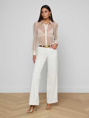 Crafted in Swiss dot voile, the Sophie blouse by L'agence exudes confident femininity. Its classic button closure and structured contrast shirt collar balance its airy silhouette. Wear it with the matching Lexi camisole and tuck it into high-waisted trousers for a polished, chic look. Description: - Straight fit. - Button closure. - Contrast shirt collar. - Length (shoulder to hem): approximately 24.6 in / 62.5 cm. - Sleeve length: 25.3 in / 64.3 cm. - Sheer. - Color: Ecru. - True to size. - Model is 5'9.5" with a 32" bust, 24" waist, and 35" hips, and wears size XS. - 100% polyester. - Dry clean only.